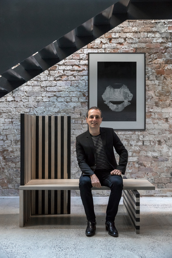 Adding just a hint of Greg Natale glamour to the composition are three brass strips set modestly between the black and white striations - two running through the bench’s vertical elements, the other running horizontally.
