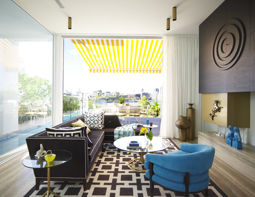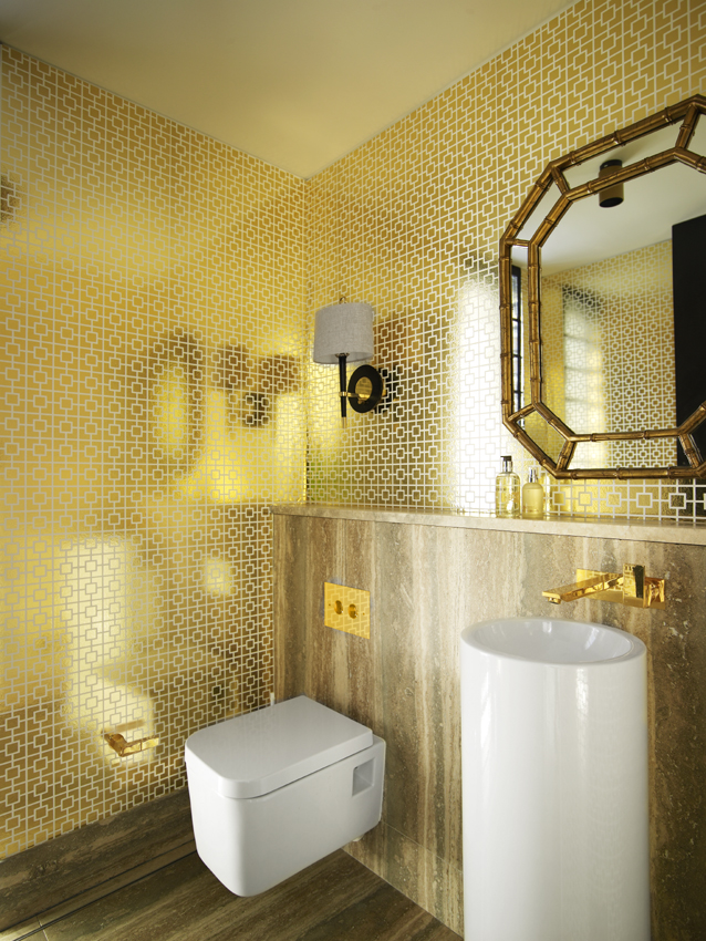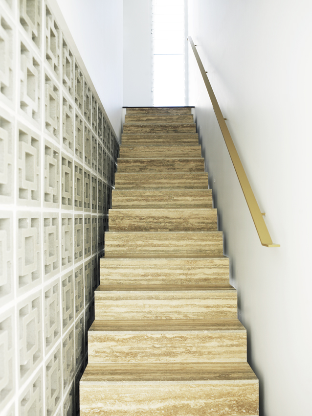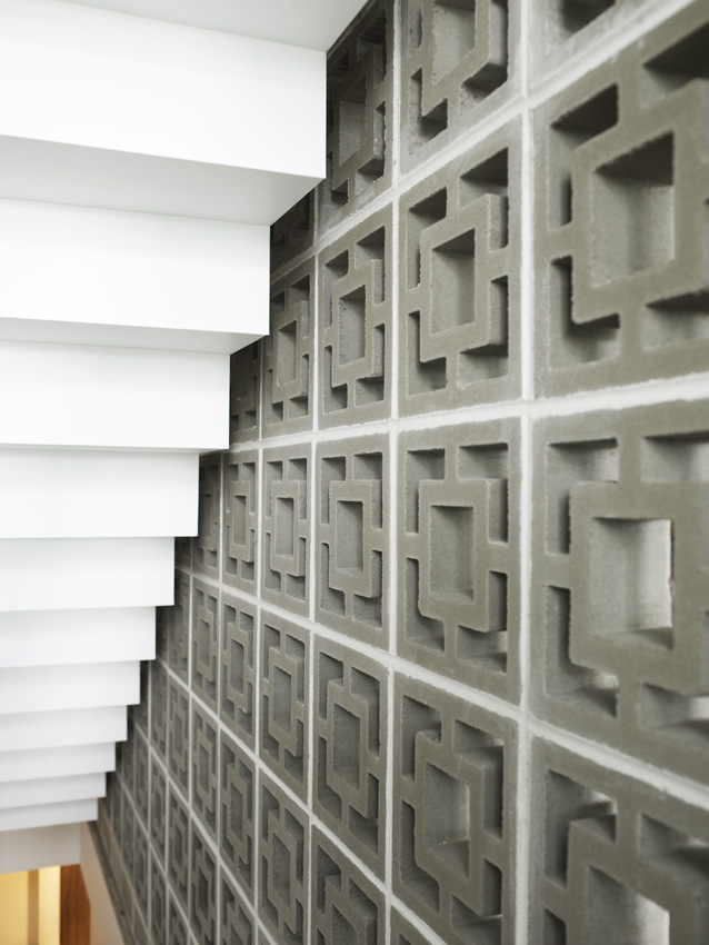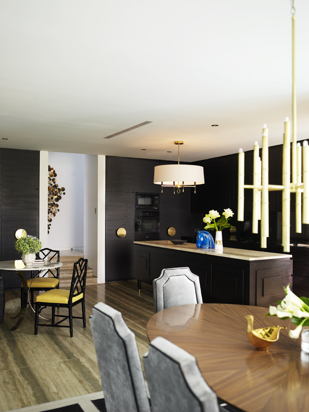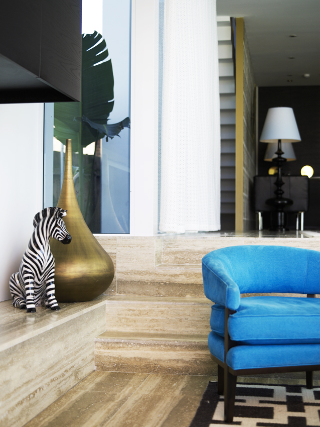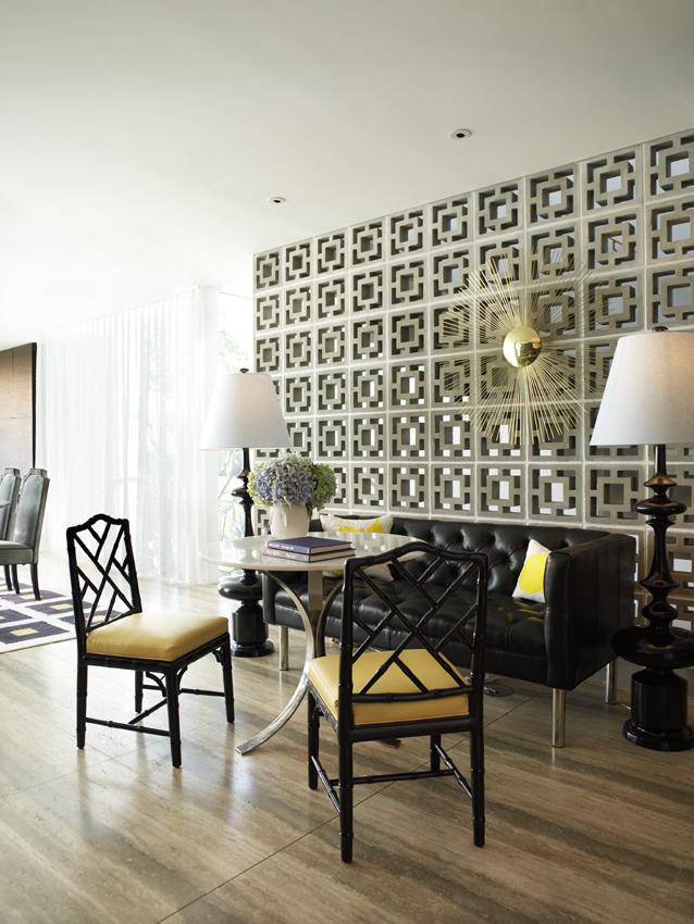 Jonathan Adler pieces enhance the Hollywood Regency style and upbeat palette, while retro-inspired besser blocks divide the kitchen and main staircase yet still allow light and air to permeate.
