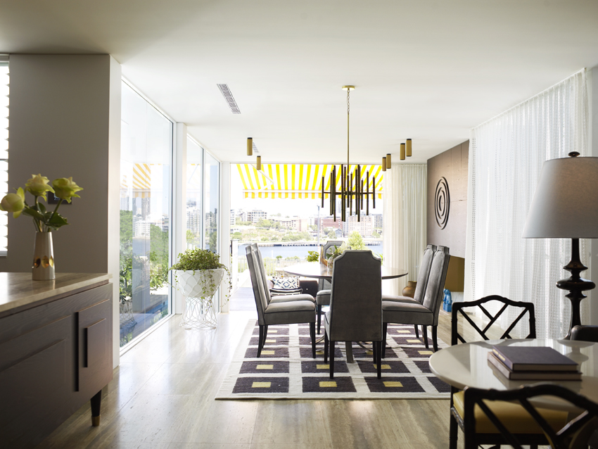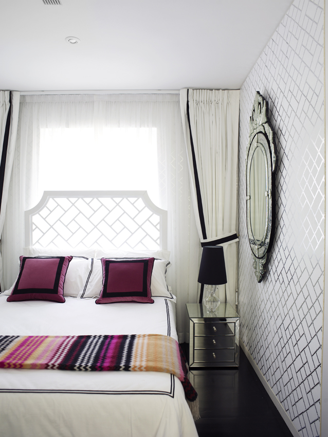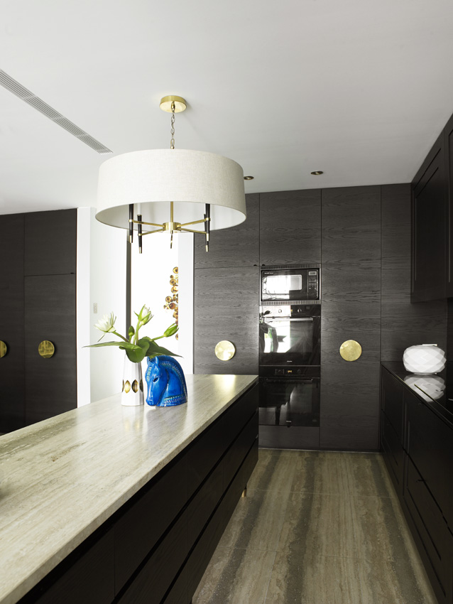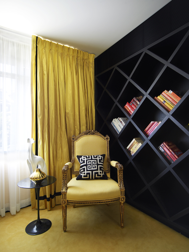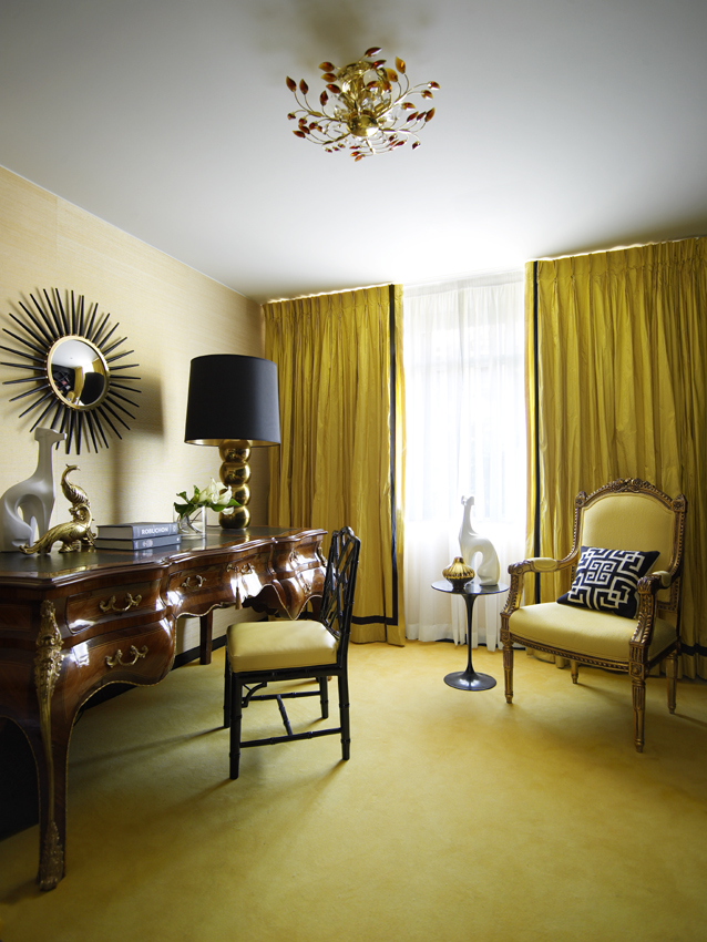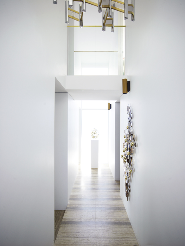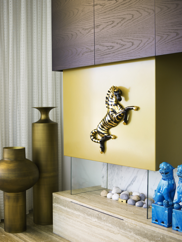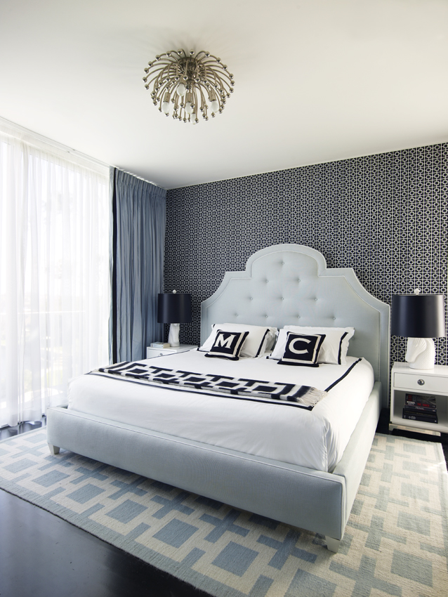 Jonathan Adler pieces enhance the Hollywood Regency style and upbeat palette, while retro-inspired besser blocks divide the kitchen and main staircase yet still allow light and air to permeate.