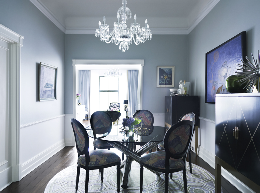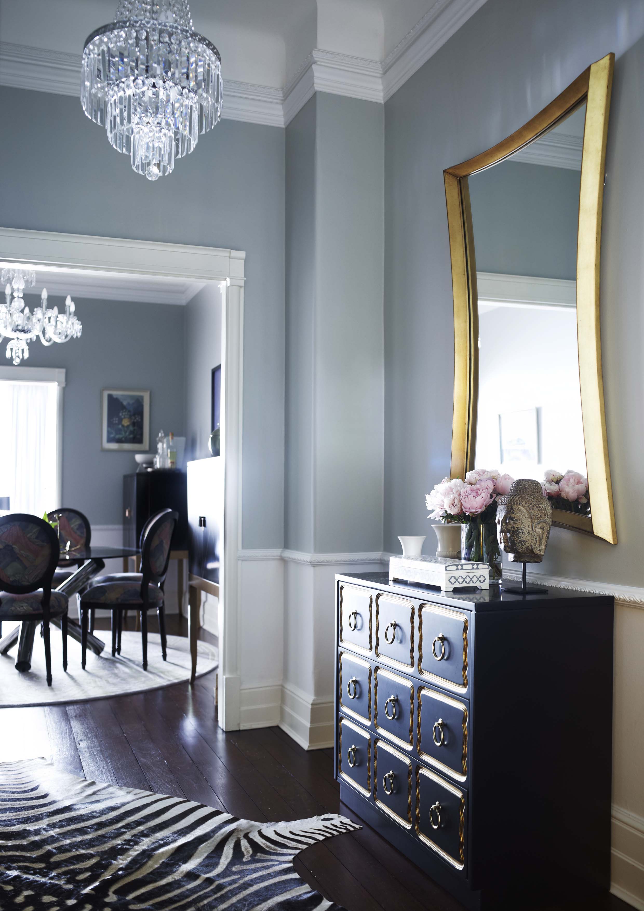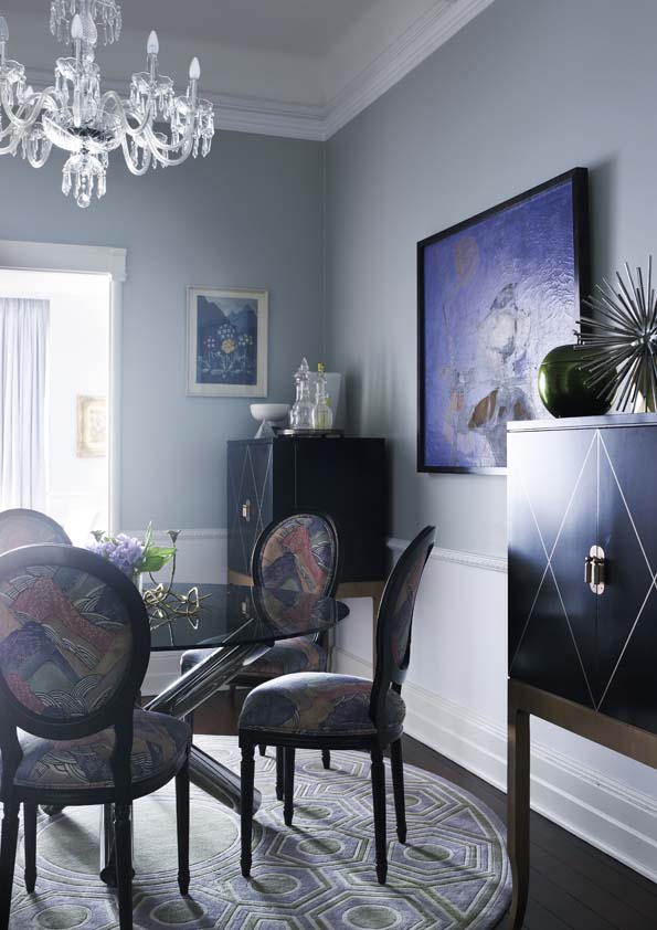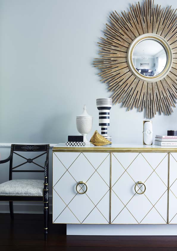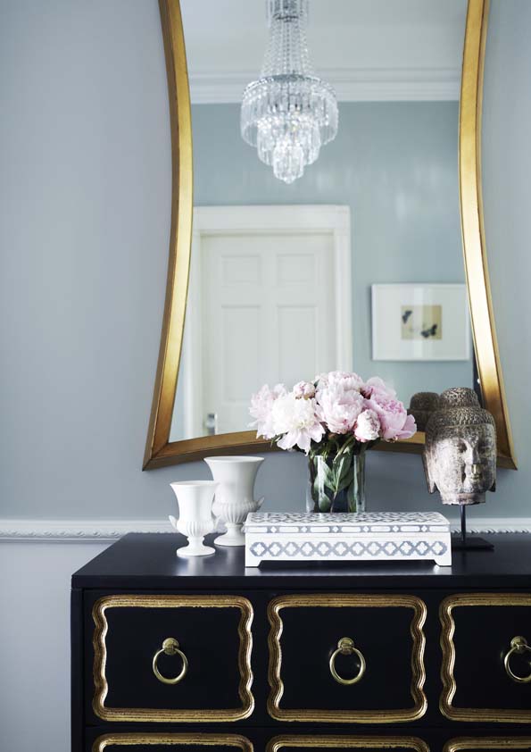 Monochromes anchor the design, providing a strong note against dove-grey walls, with key colours defining different spaces, such as vivid blues in the dining room and green in the hand-painted kitchen. Mid-century ceramics and modern furniture continue to blend old and new, while gilt touches add glamour.
