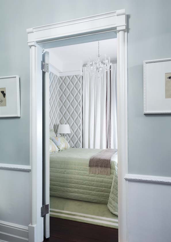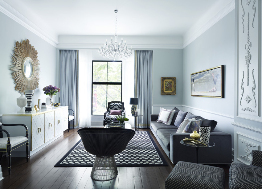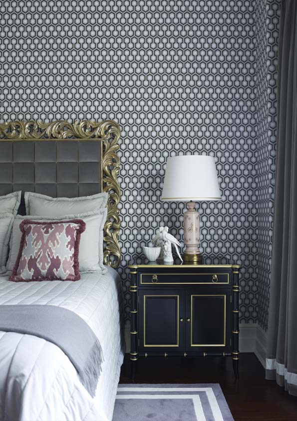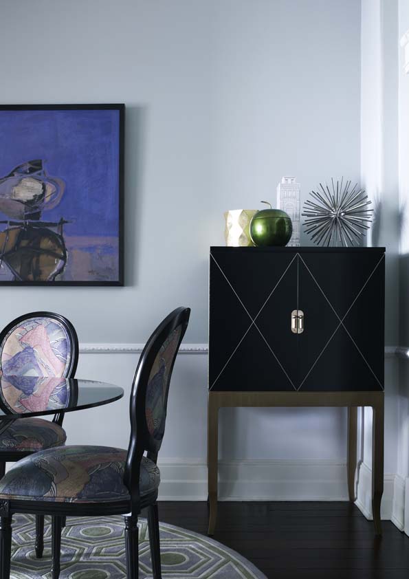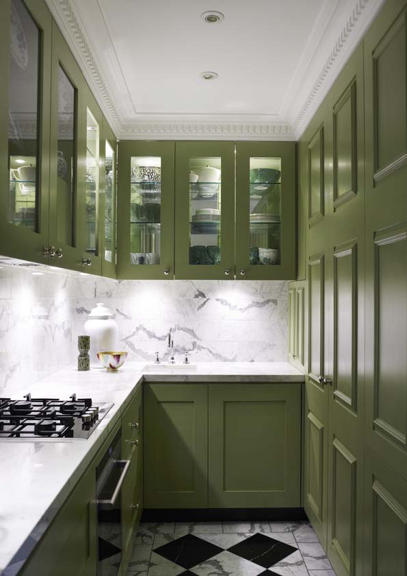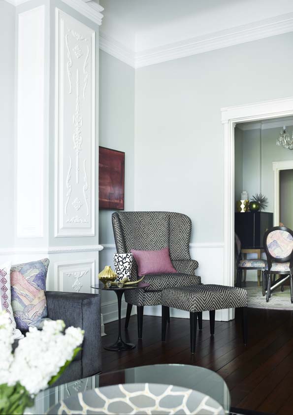 Monochromes anchor the design, providing a strong note against dove-grey walls, with key colours defining different spaces, such as vivid blues in the dining room and green in the hand-painted kitchen. Mid-century ceramics and modern furniture continue to blend old and new, while gilt touches add glamour.