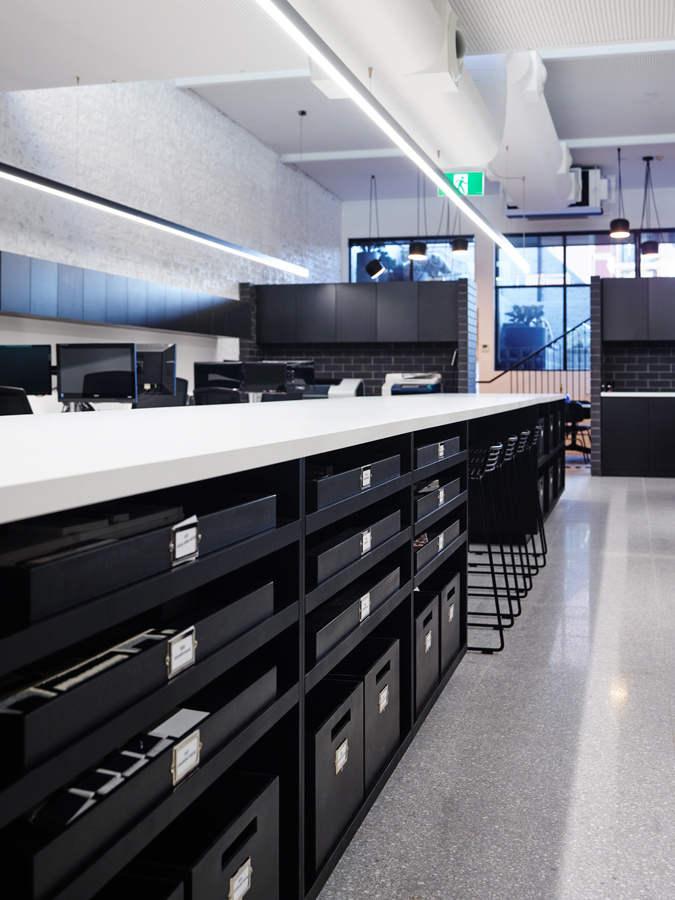 Embracing the complex combination of roles of architect, builder, interior designer and client, Greg Natale embarked on the detailed renovation of a building in Sydney’s Surry Hills for the practice's brand new headquarters. The existing 1960's building was stripped to form a generous building of four split levels that comprise an entrance and board room, reception area, meeting rooms, kitchen, staff room, bathroom, show room, design studio, administration offices, samples library, private office, showroom and roof terrace.