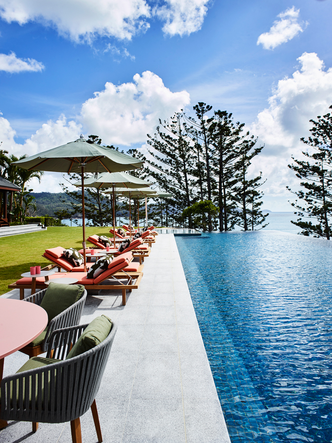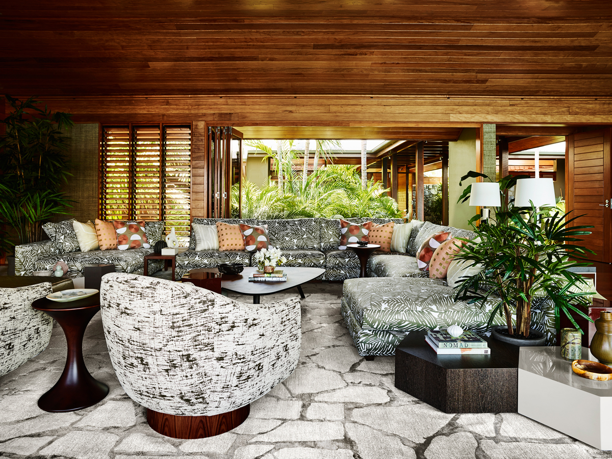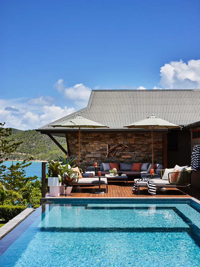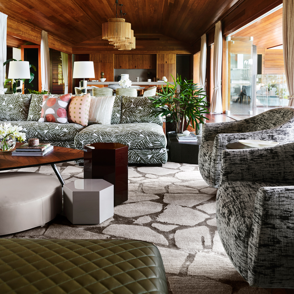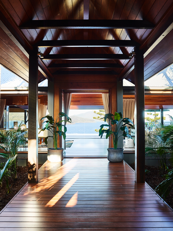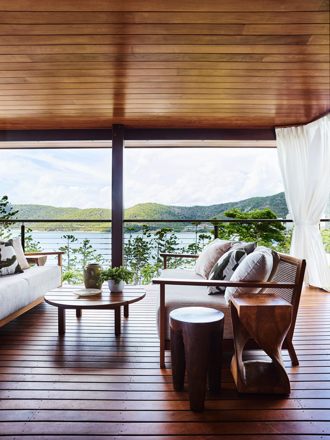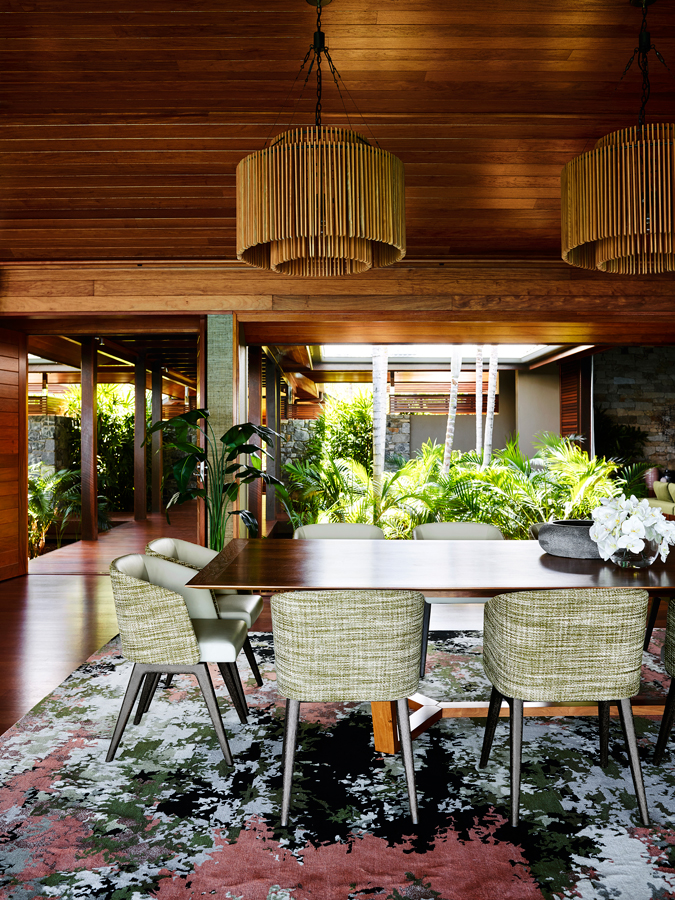 An exceptional vacation home for a young family, one of the features this eight bedroom property shares with tropical Australian resorts is a focus on bringing the outdoors in. The house enjoys exquisite views of the Coral Sea through the native hoop pines, as well as abundant plant life at its doors - as an interior designer establishing a connection to those elements was central to the concept.