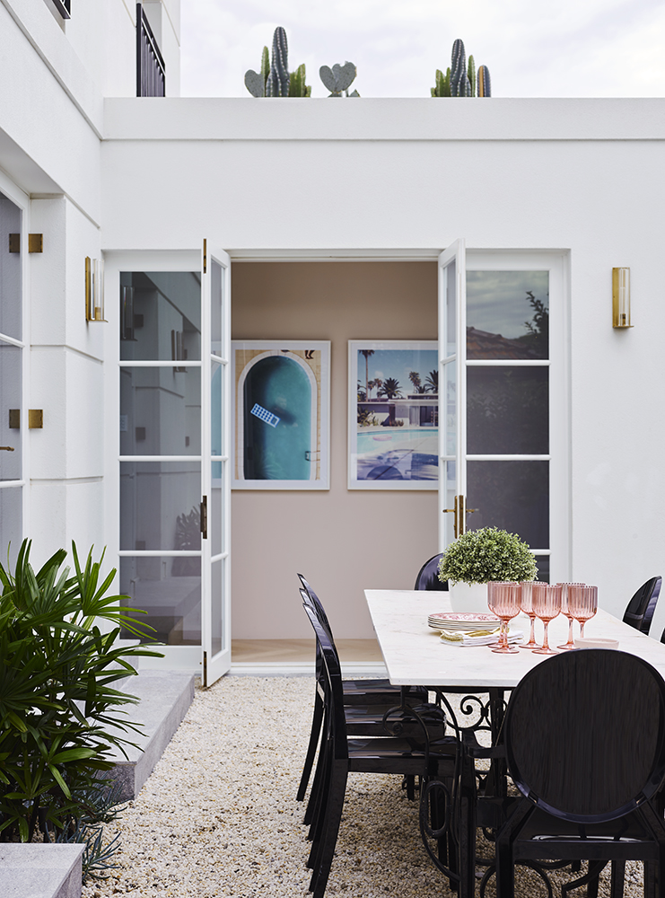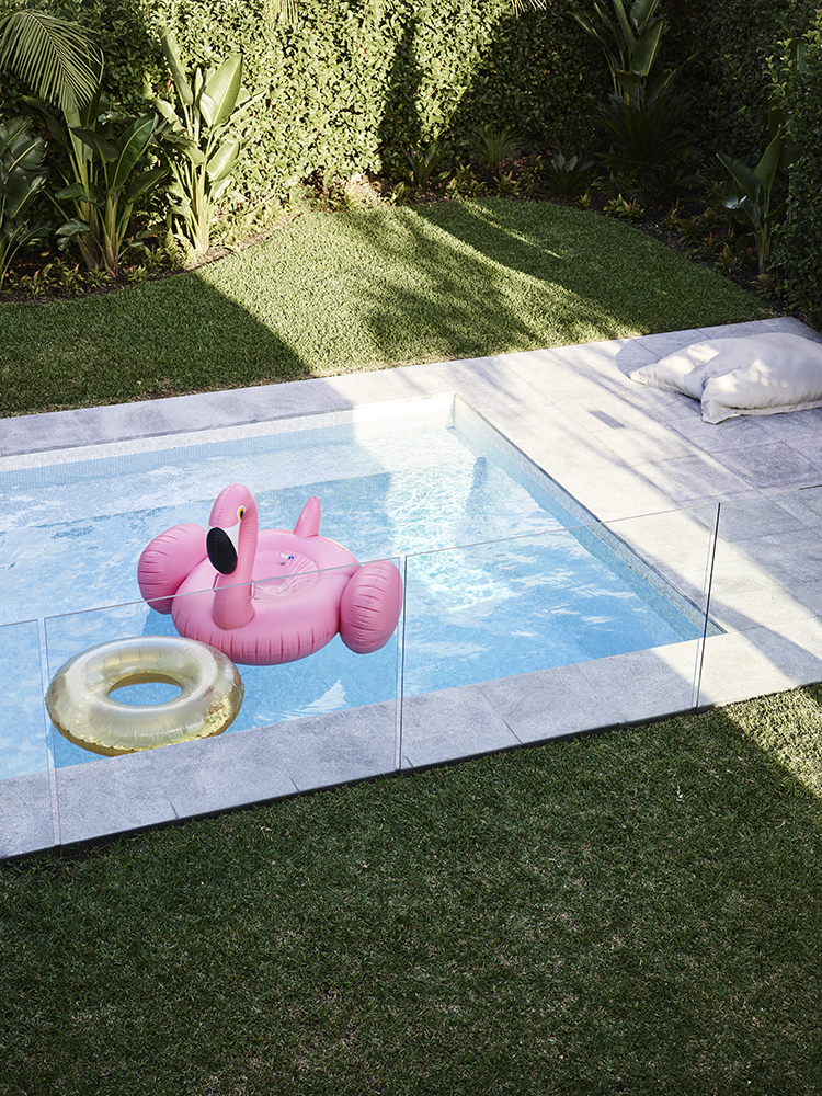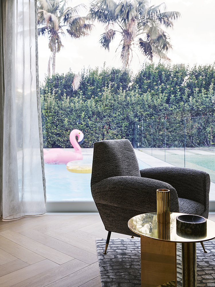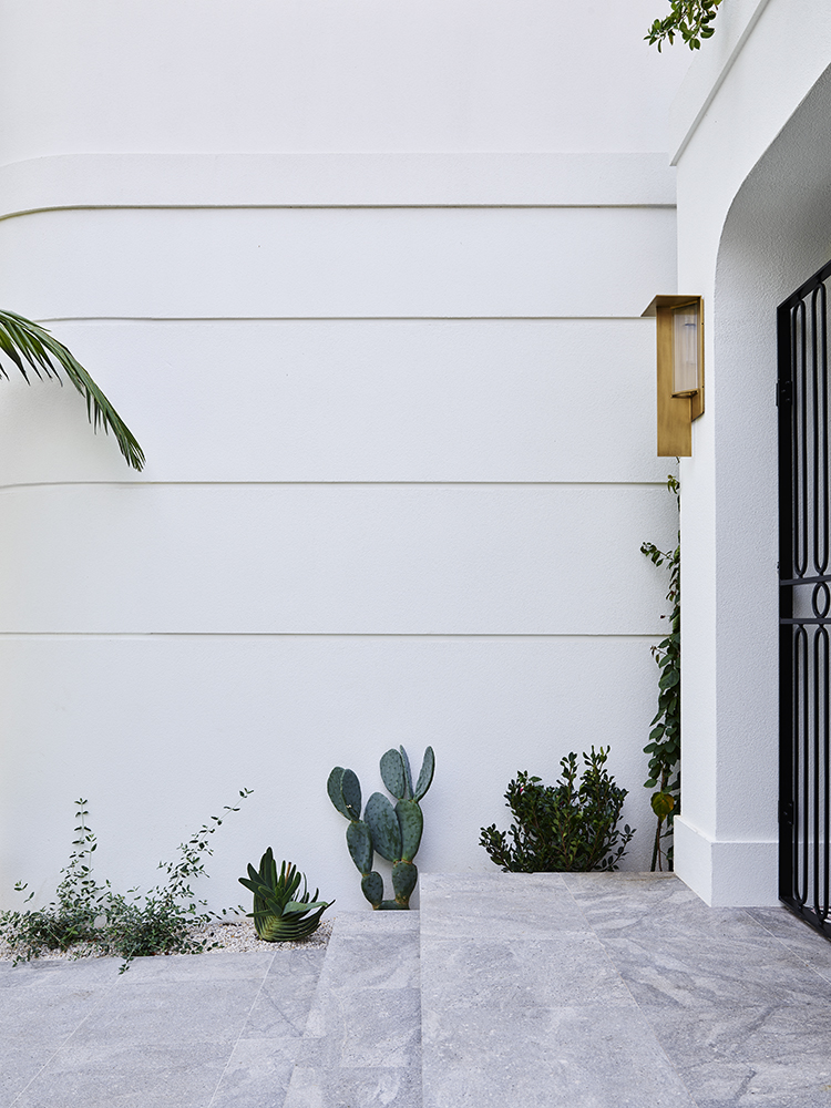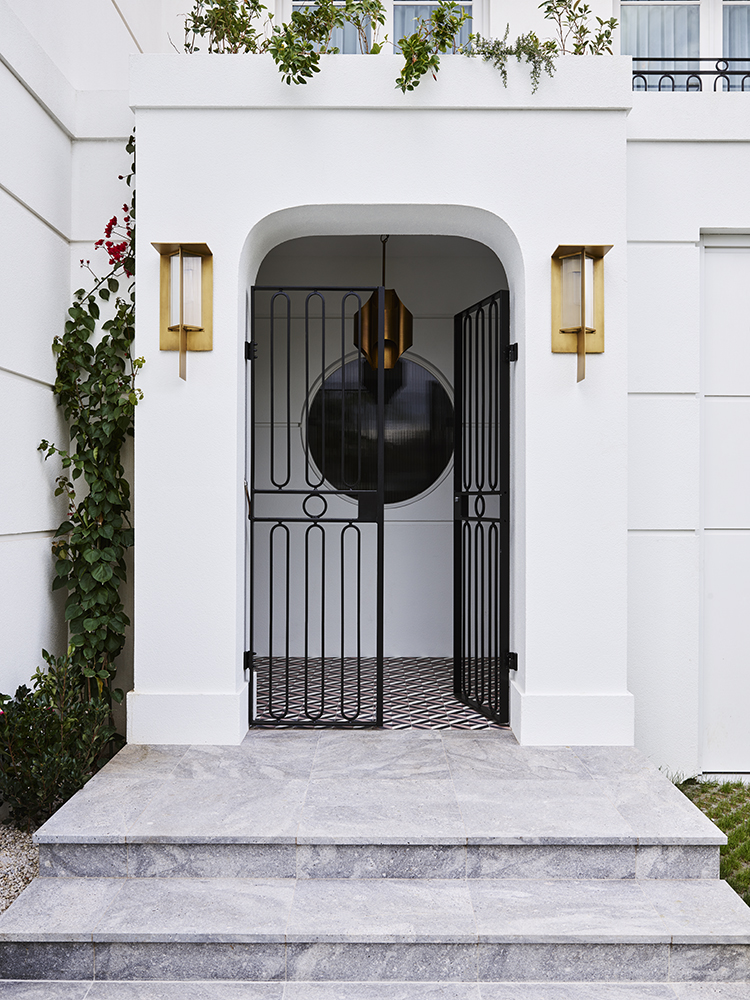 Designed for entertaining, much of the family home opens out to the Myles Baldwin designed gardens and pool. Custom metal work features in the home's grills, balcony rails and gates with Greg Natale tiles welcoming guests in the portico.