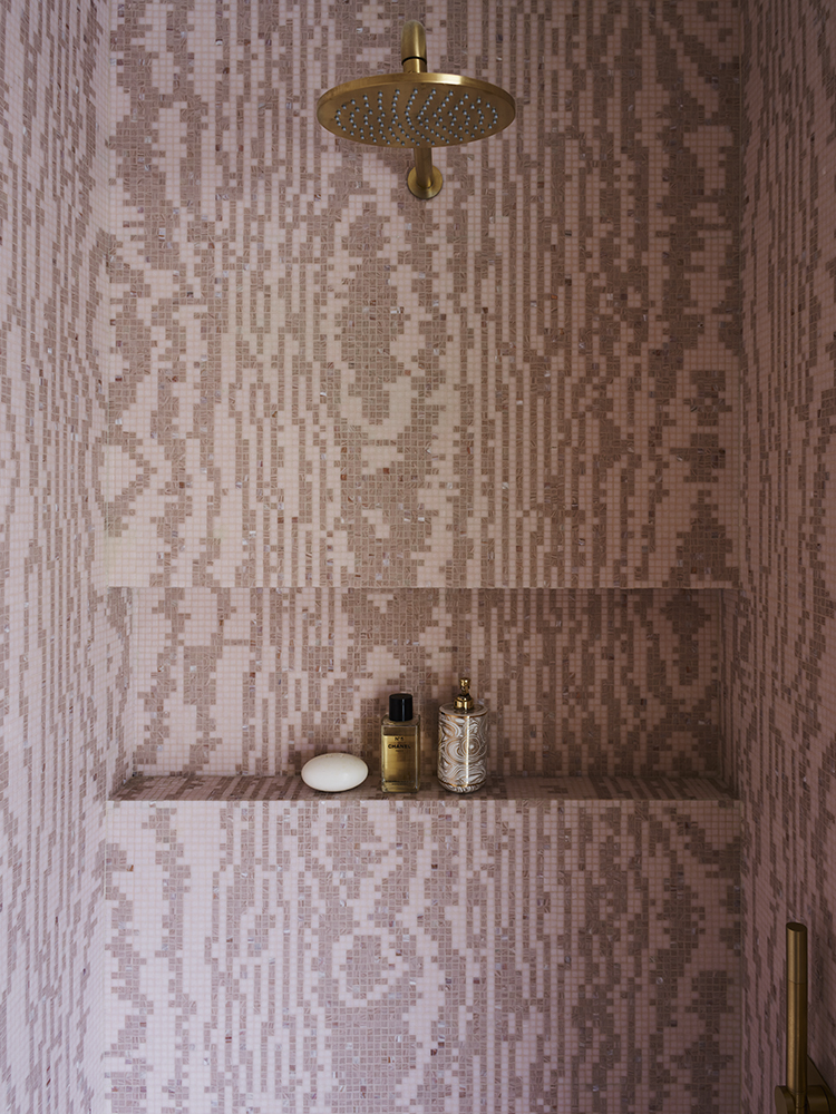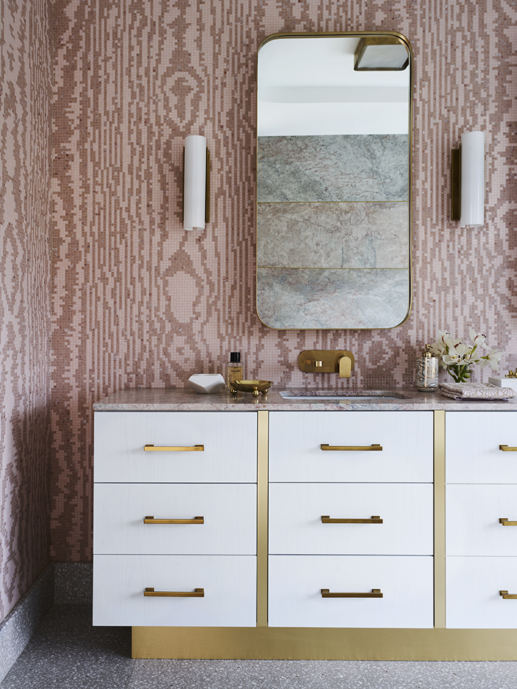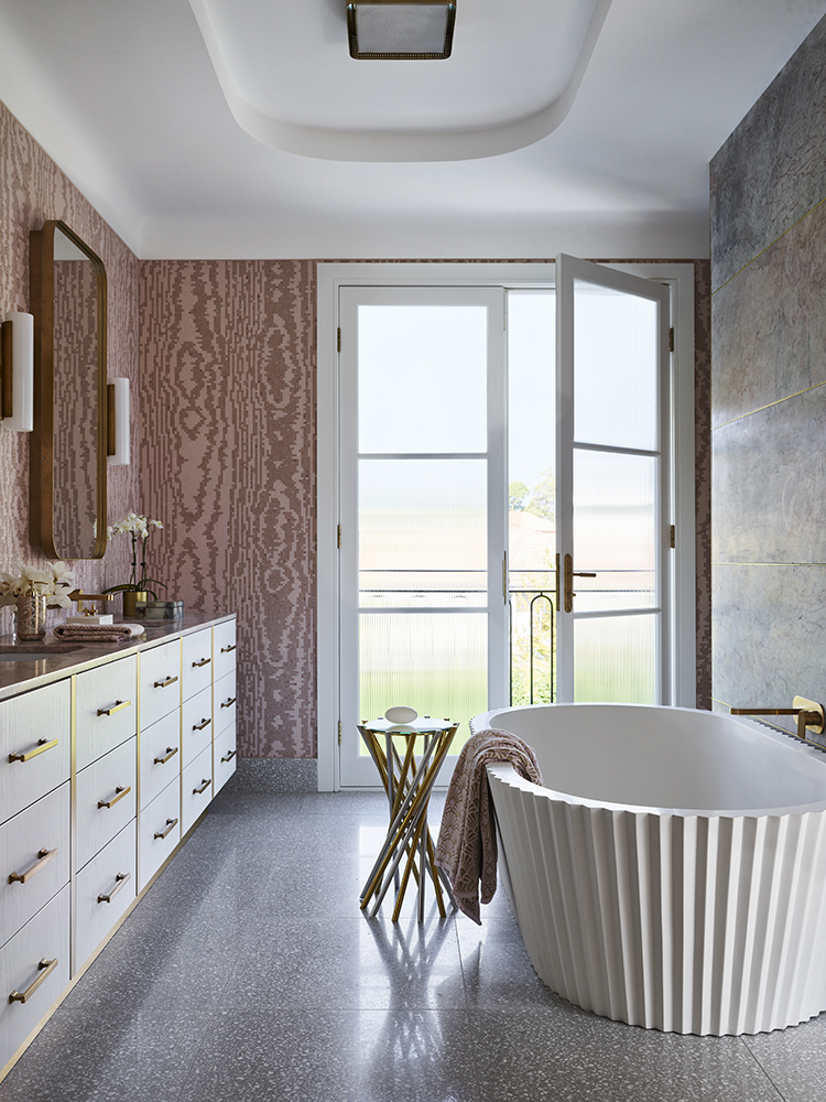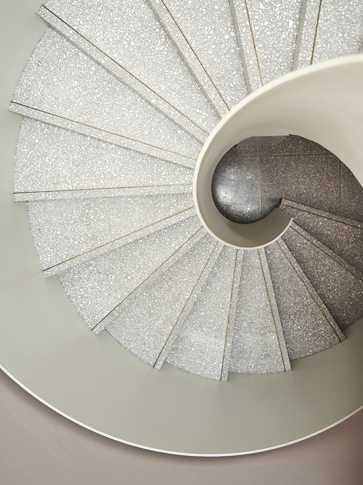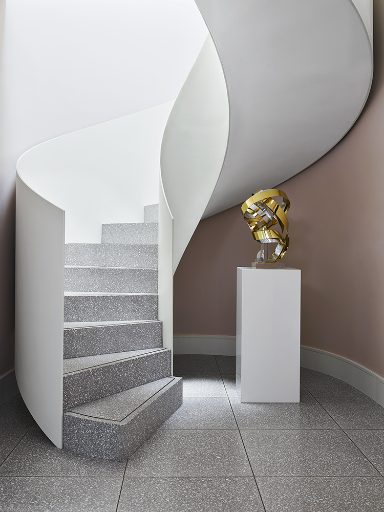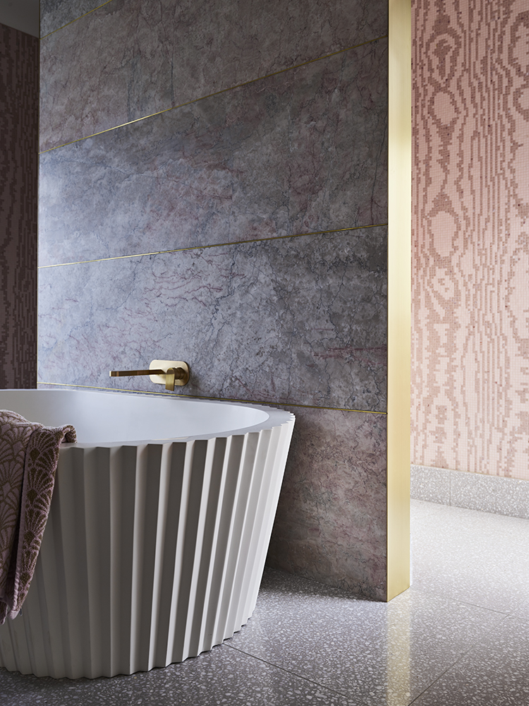 The custom spiral grey terazzo stair features brass inlay with a limited edition piece from sculptor Dan Murphy taking pride of place at the foot of the stair. The master ensuite of the home creates a lasting impression with Greg Natale's Moire pink mosaic tile design for Bisazza gracing the walls.