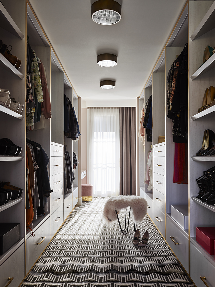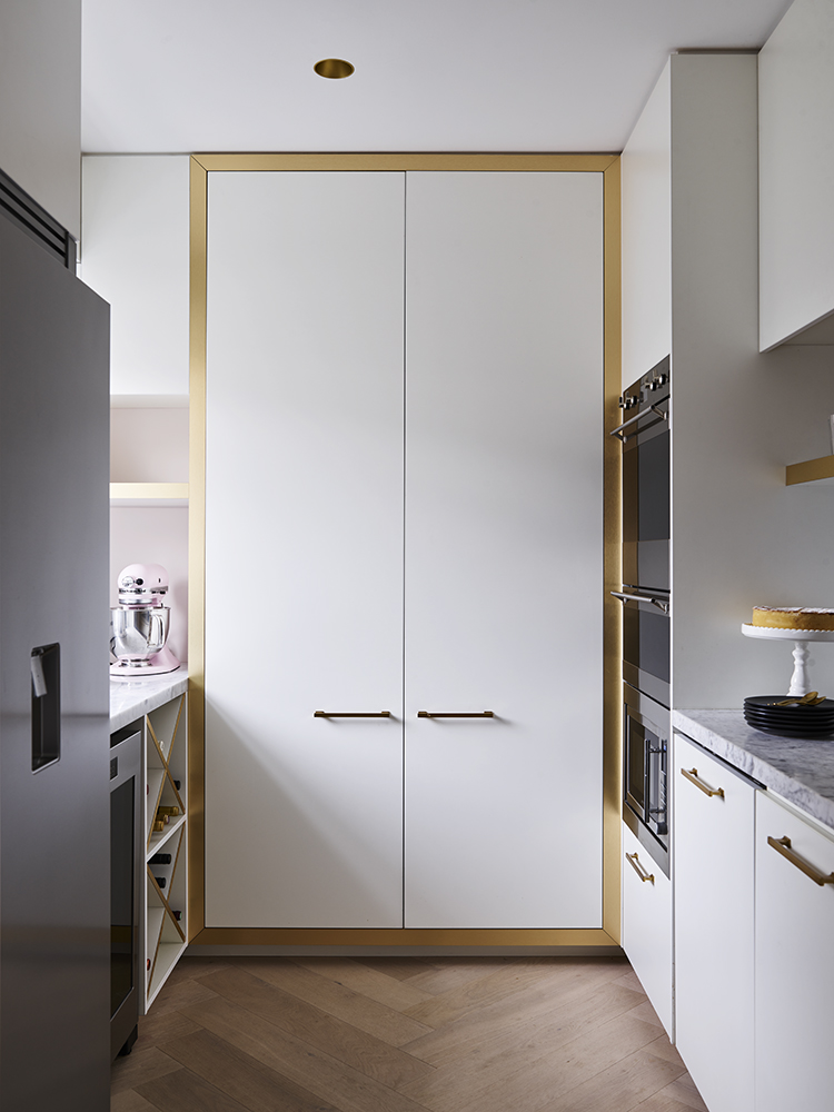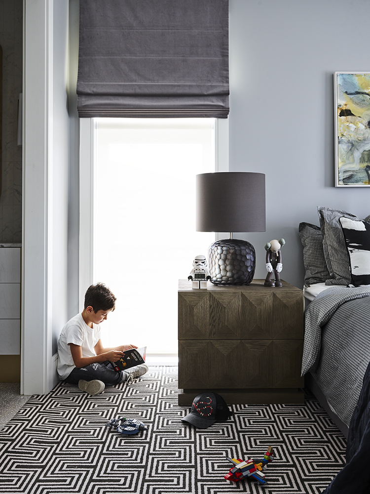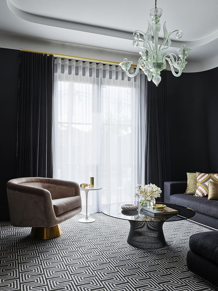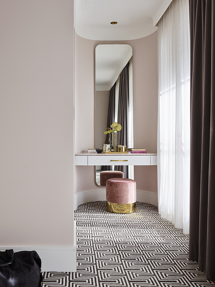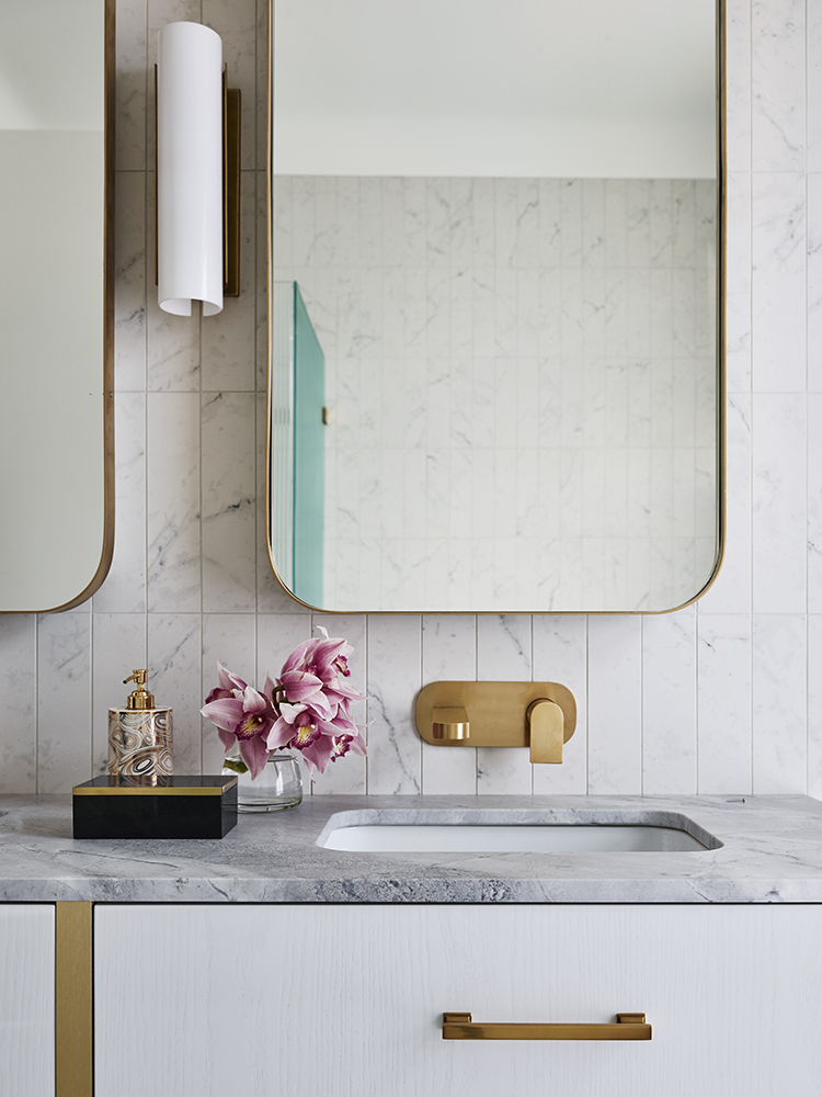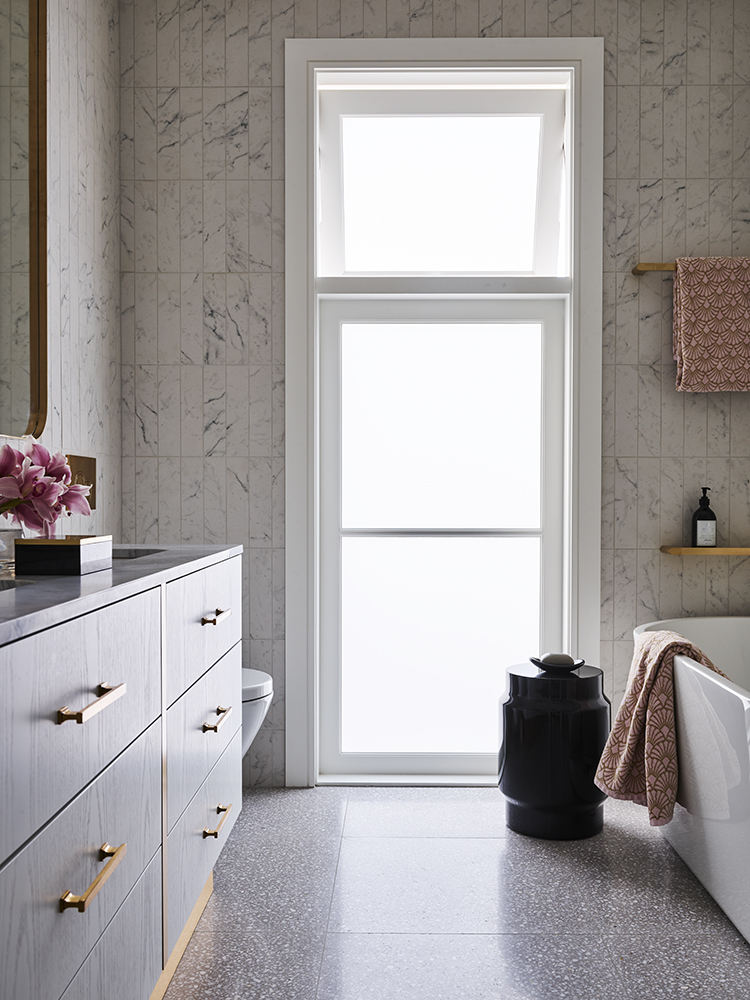 The custom spiral grey terazzo stair features brass inlay with a limited edition piece from sculptor Dan Murphy taking pride of place at the foot of the stair. The master ensuite of the home creates a lasting impression with Greg Natale's Moire pink mosaic tile design for Bisazza gracing the walls.