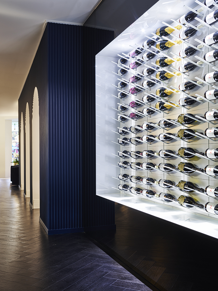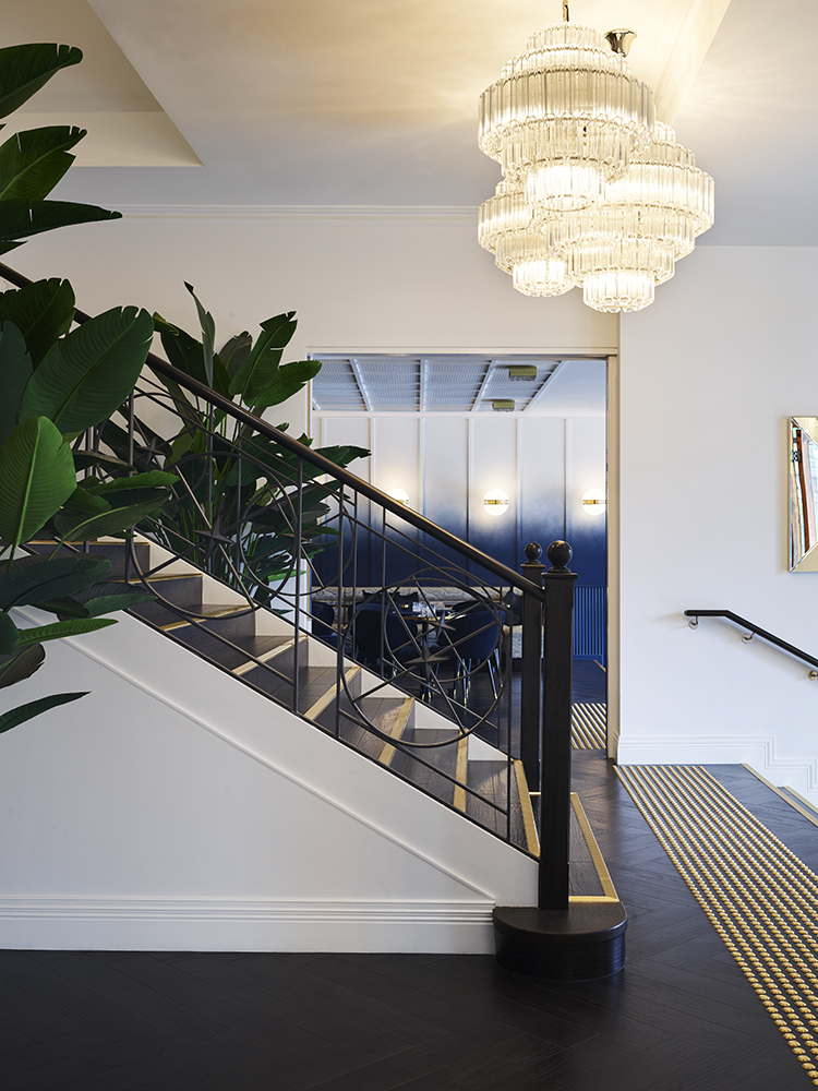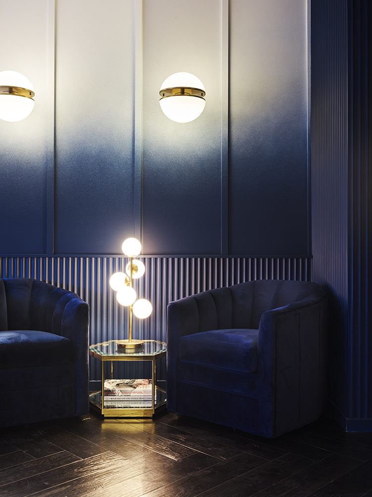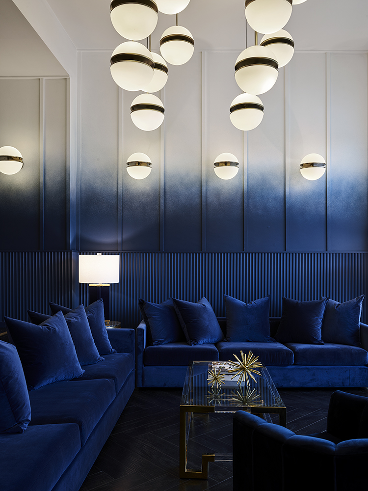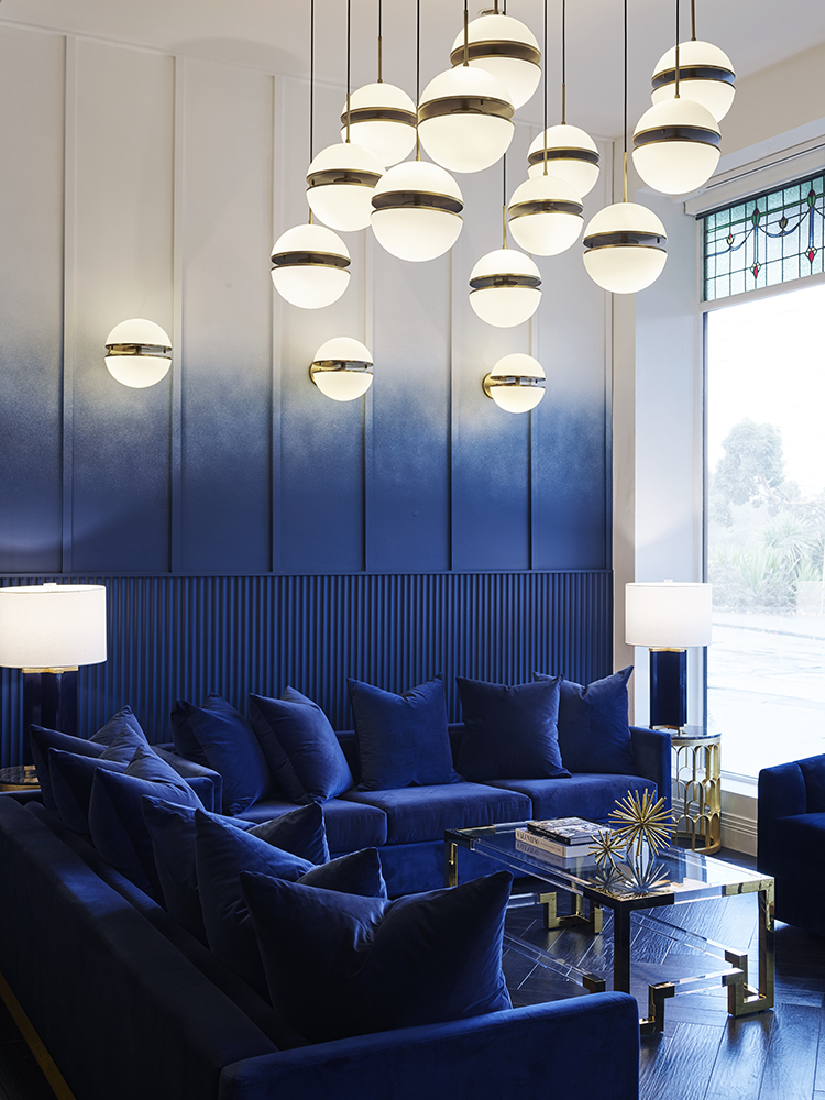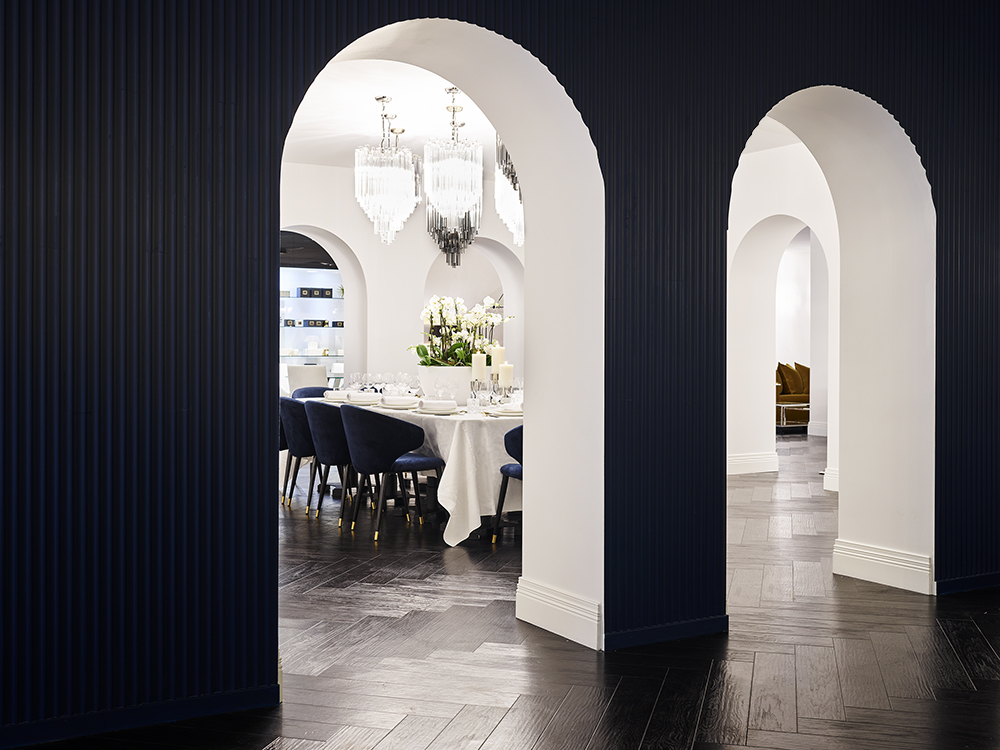 The custom painted ombre walls are a signature of the space graduating from the black stain timber floors through to the white ceiling overhead. The richness of the blue paint is carried through the upholstered furnishings as well as the fluted wall treatments that separate the arched private dining room from the bar area.