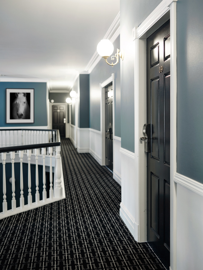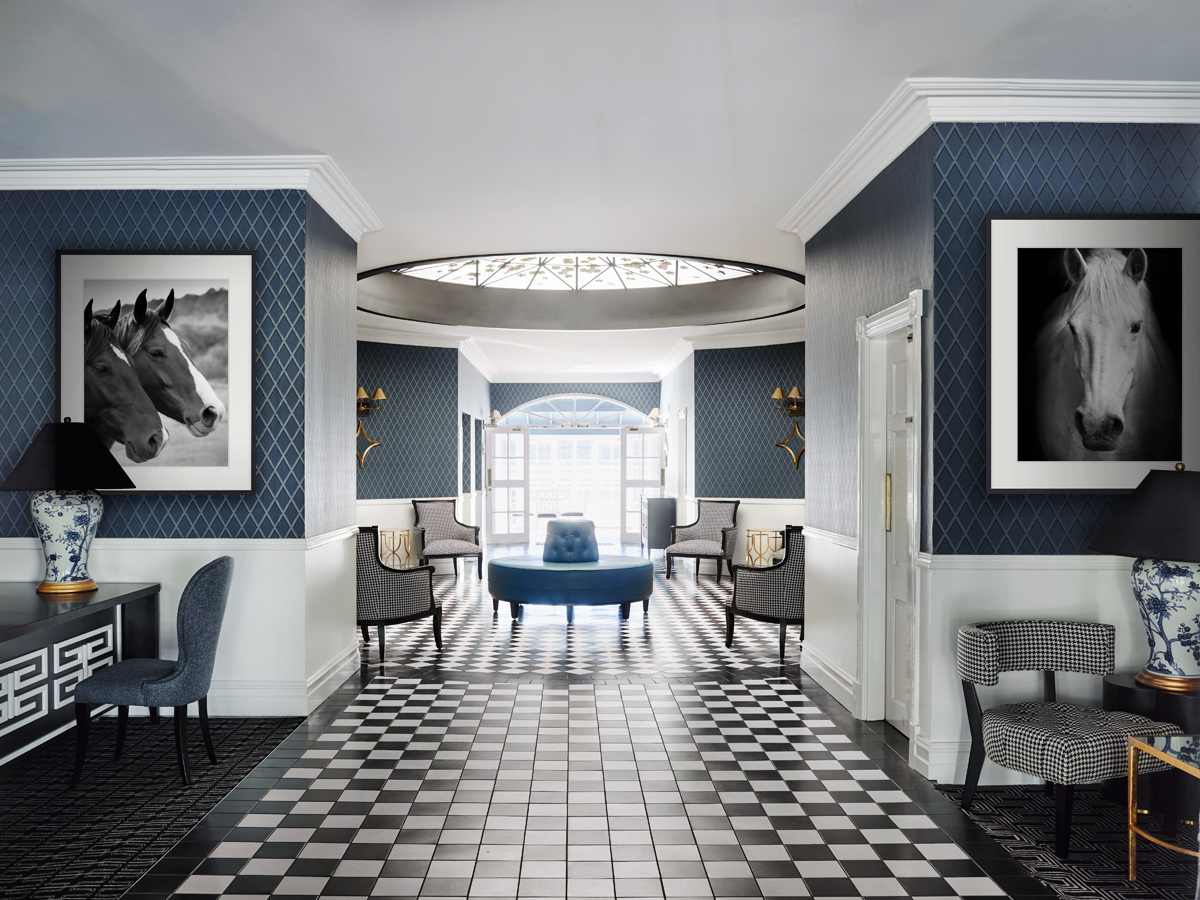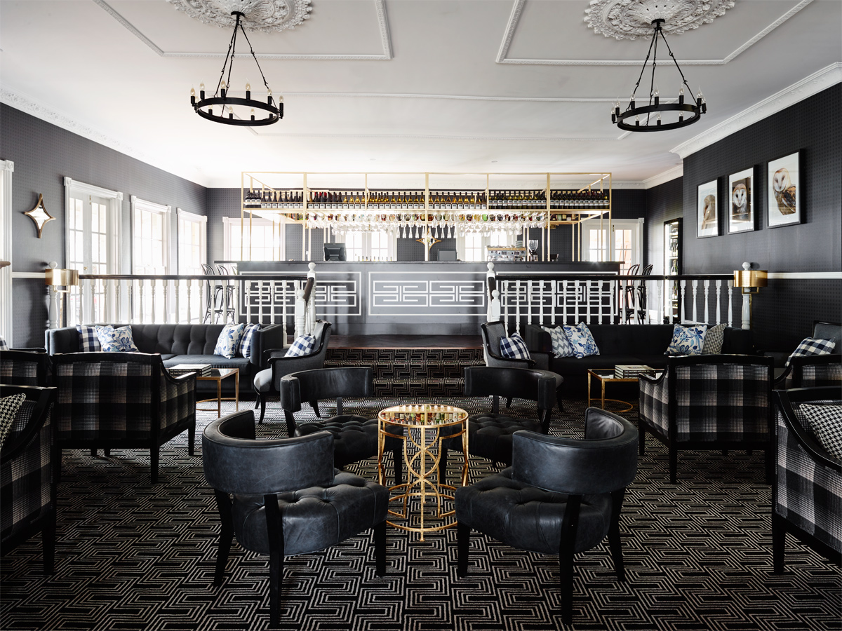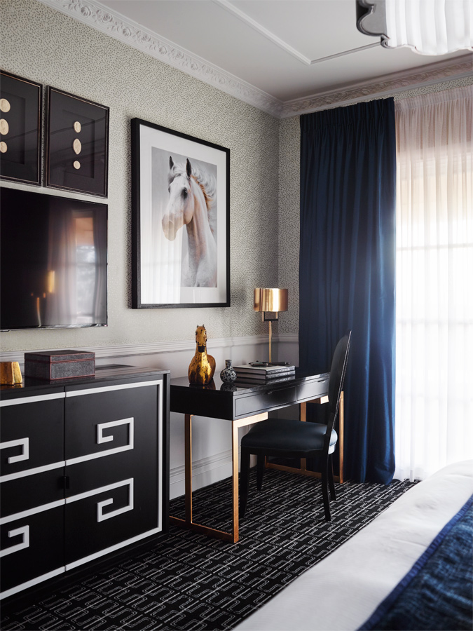 It is not only the hotel’s design that reveals Natale’s vision, but much of its décor as well. Greg Natale’s Hudson furniture features throughout, as do several of his wallpapers from Porter’s Paints. The entry hall, reception and atrium are all magnificently hued in Atlantic Pearl, a sophisticated blue that pops through the entire hotel and is complemented by a monochrome palette as well as gilt and brass finishes.