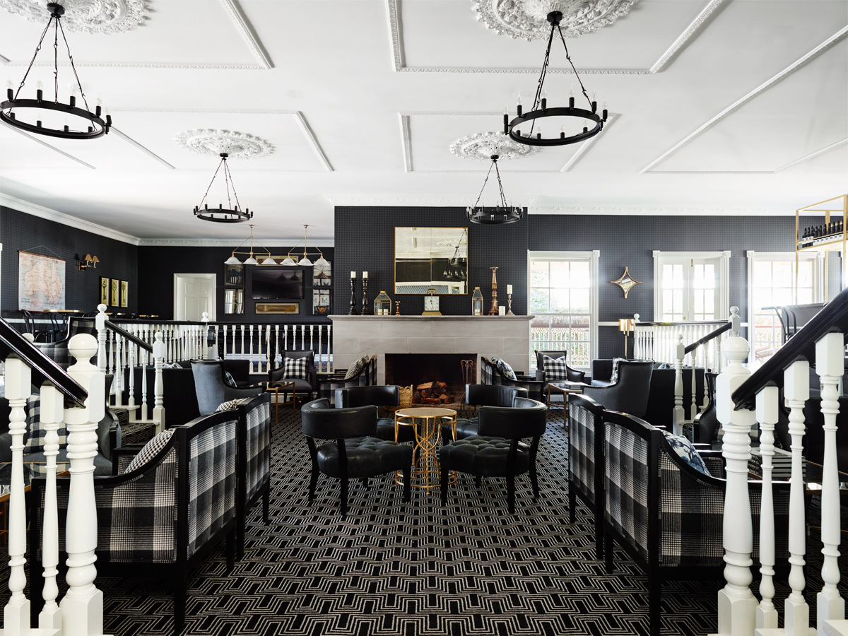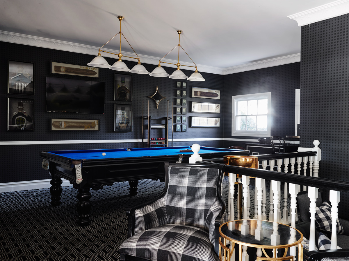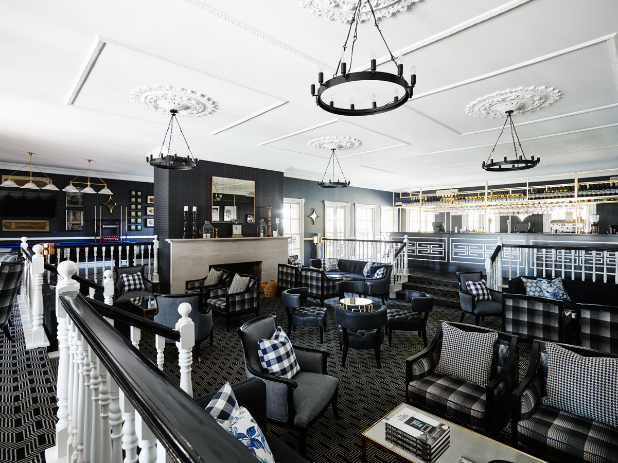 Monochromes feature in the stunning new split-level bar and lounge, where Natale’s patterned carpets enhance the luxurious atmosphere. Here, a sunken lounge radiates from the working fireplace and leads up to a black and brass-detailed bar designed to be accessible in the round.