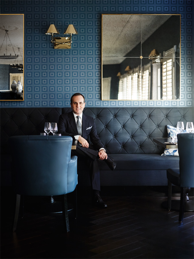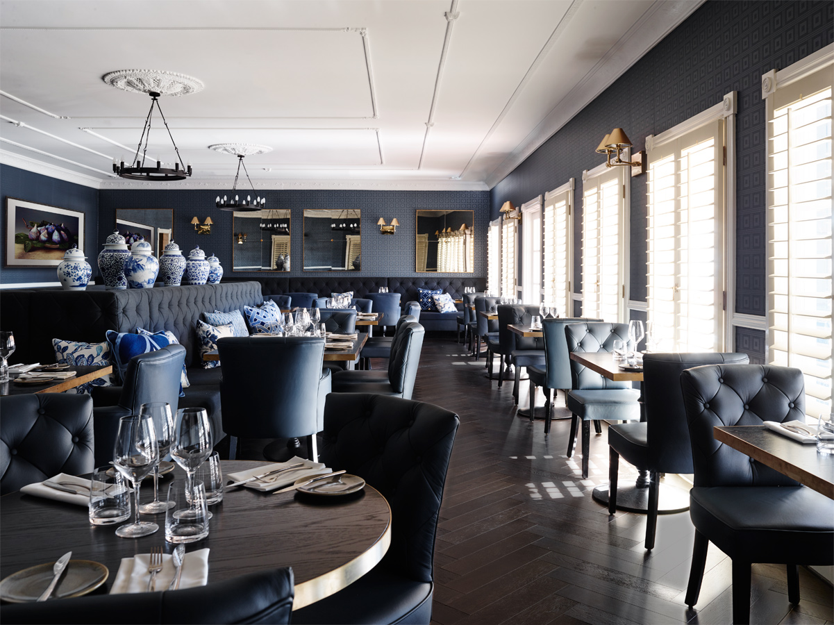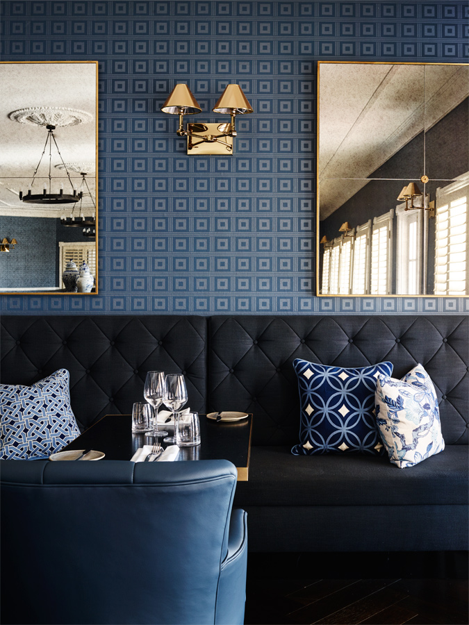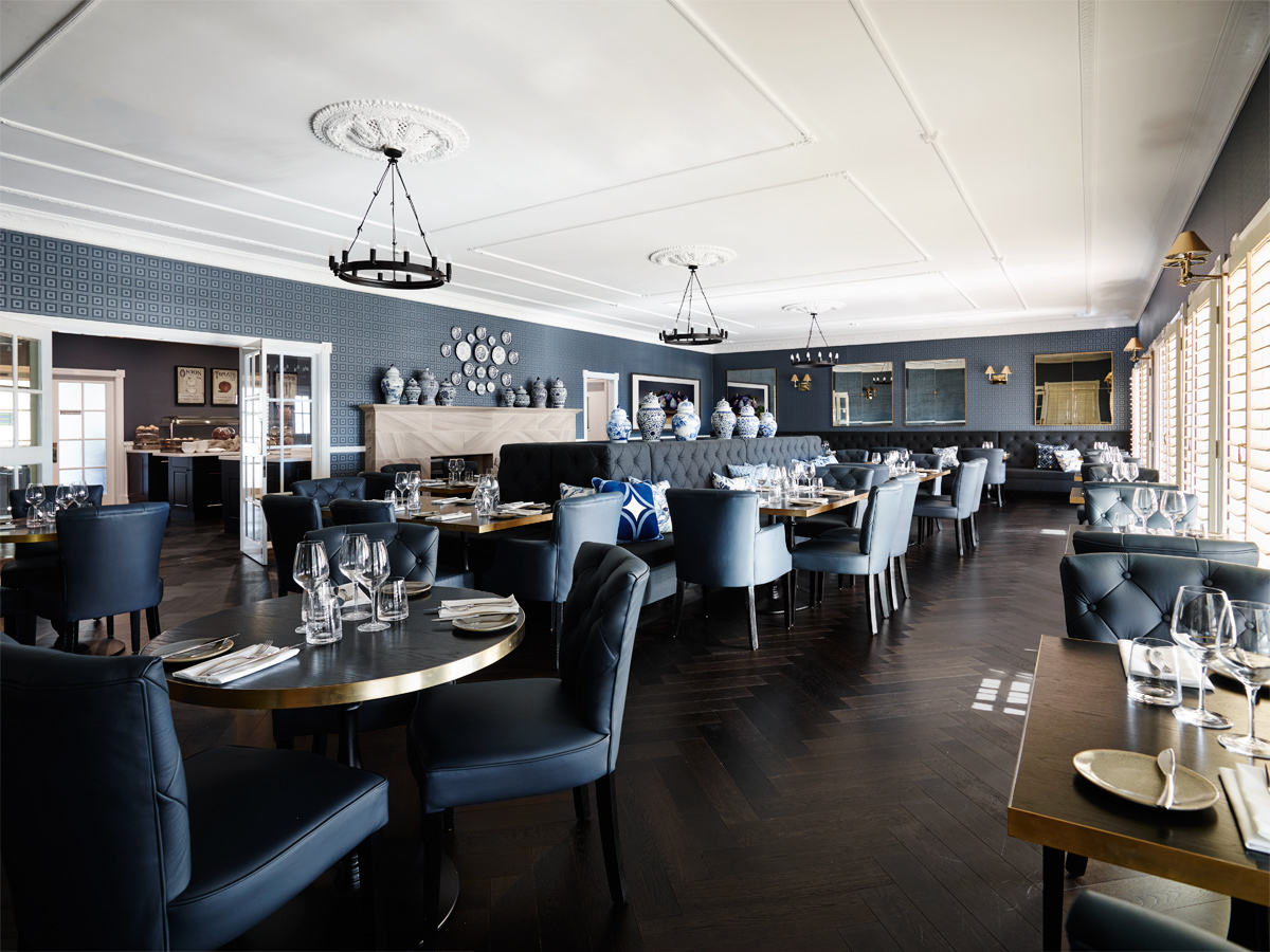 Inspired by the Sebel’s collection of blue and white china, the elegant bistro, centred round a four-sided, high-backed banquette, offsets blue wallpaper and leather dining chairs with a sultry dark timber floor and the chic white of timber shutters.