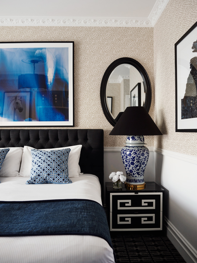 The overall mood, one of polished comfort, extends to the guest rooms. Here, elements such as Natale’s wallpaper in gold and white, continued accents of blue and the considered use of monochromes all contribute to what is an undeniably sumptuous stay.