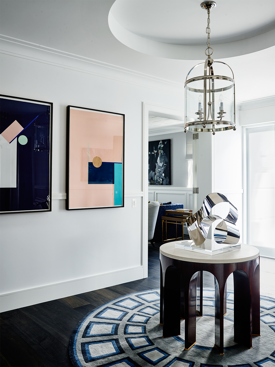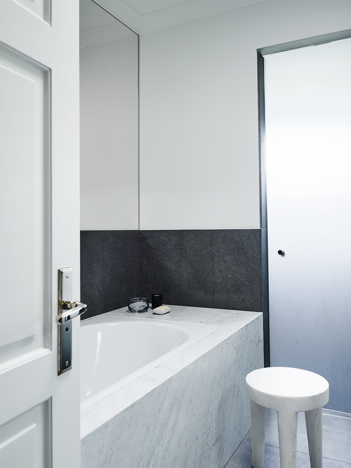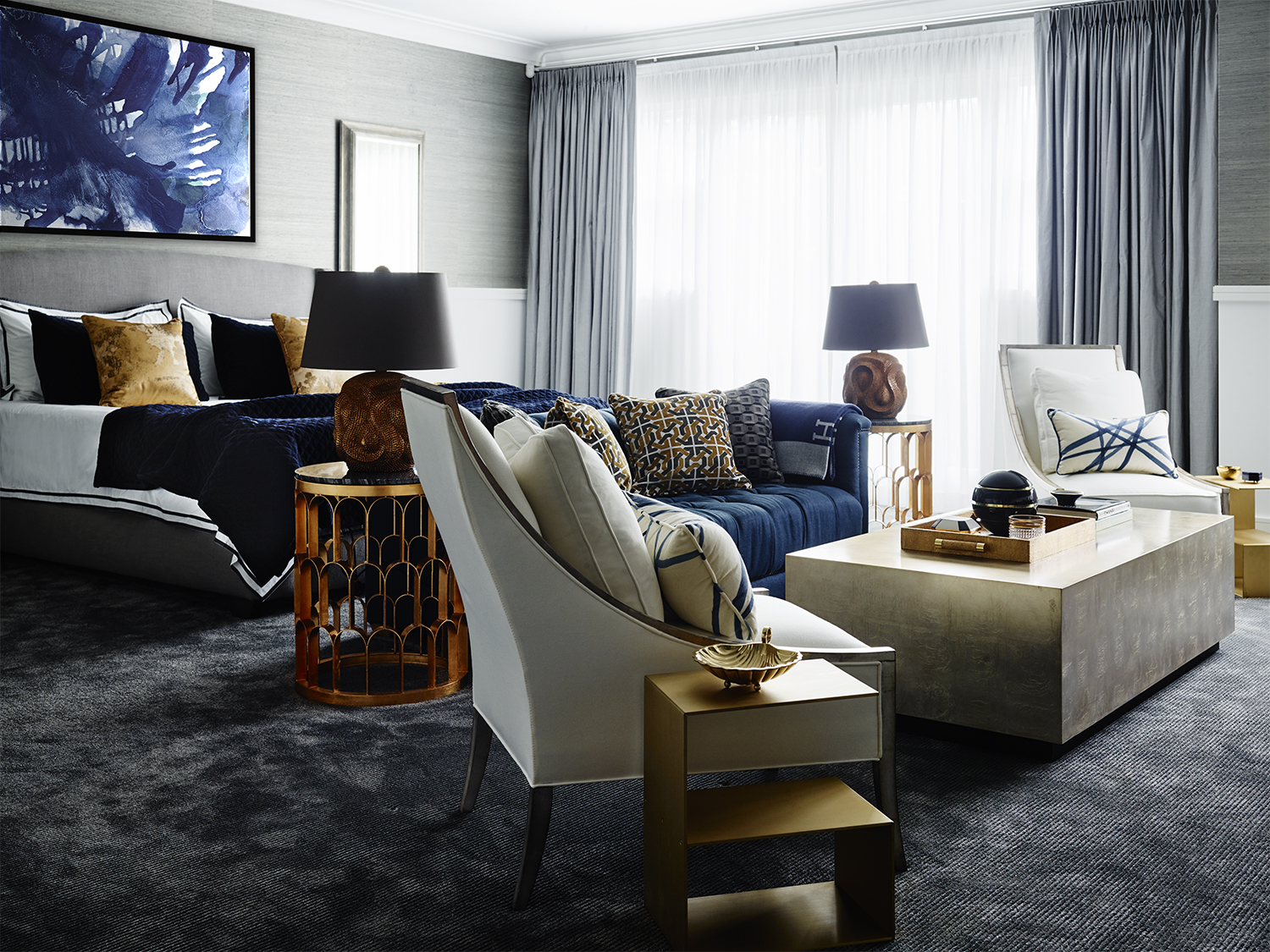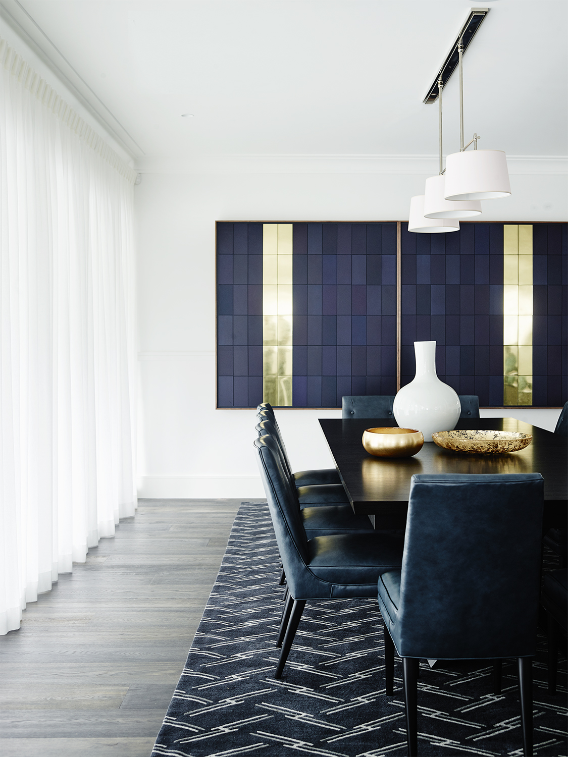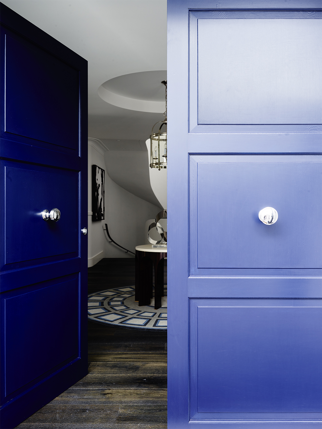 Internally, blue and grey are employed to cooly break up the white. Though impactful in creating a sense of arrival, the brilliant blue double-door entry is the sole, bold, design statement in the home. For the most part, introductions of colour and pattern are more delicately explored in the living and sleeping areas.