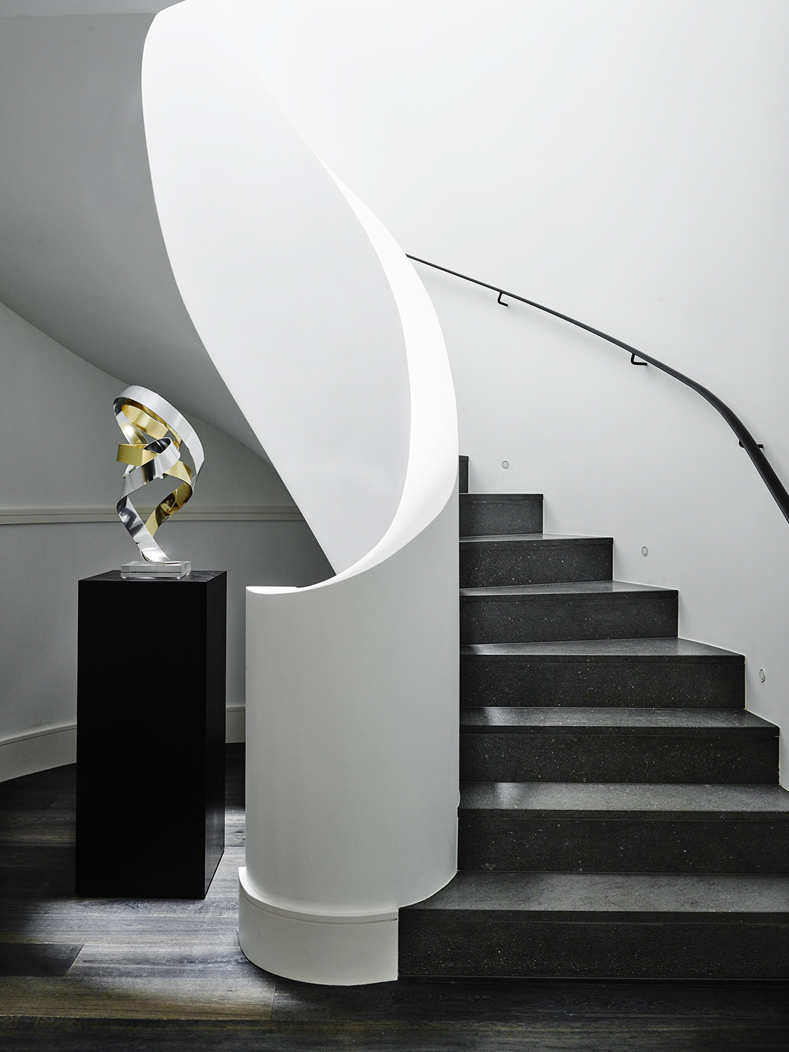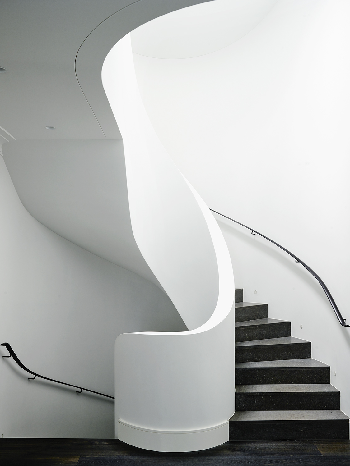 Central to the function of the building is the sinous, ribbon-like stair case grandly linking all three storeys of the home.