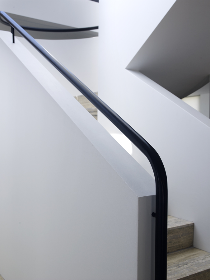Stone plays a key role in connecting interior and exterior – a wall of concrete blocks on the outside is featured on a wall in the living area, linking the spaces and breaking up the white walls. Finished in the same travertine as the ground floor, a striking ribbon staircase introduces an organic form among the angles.