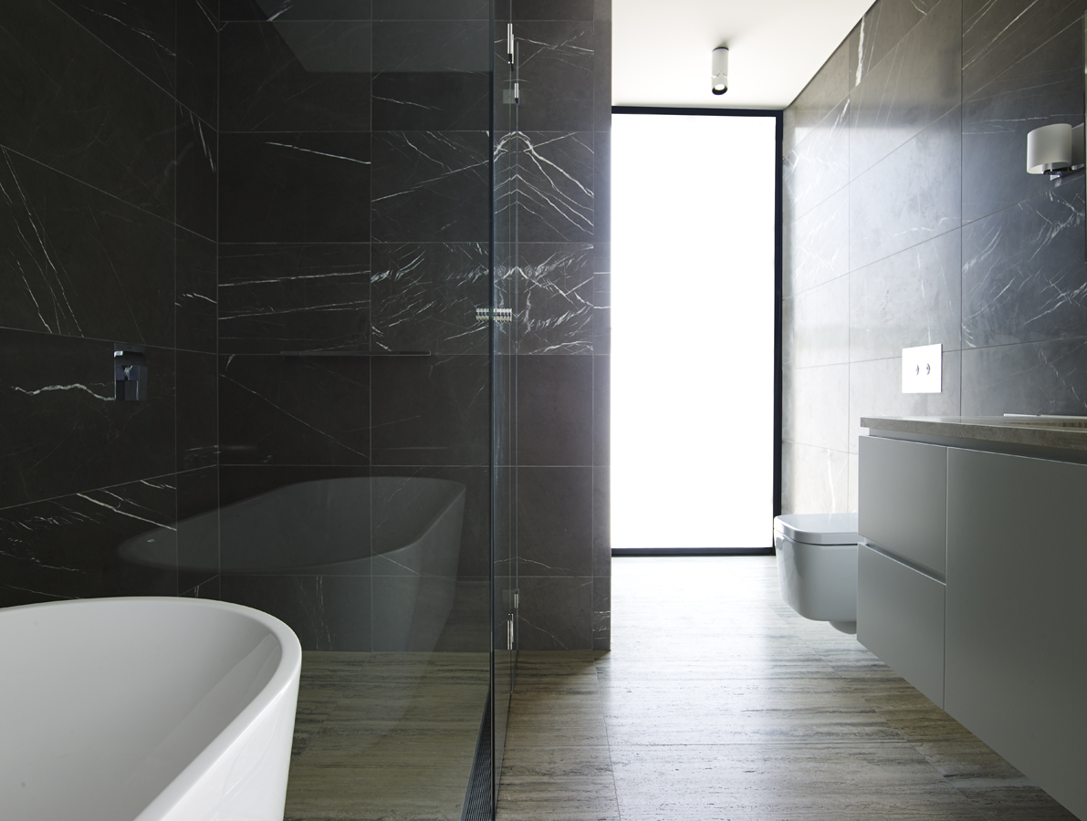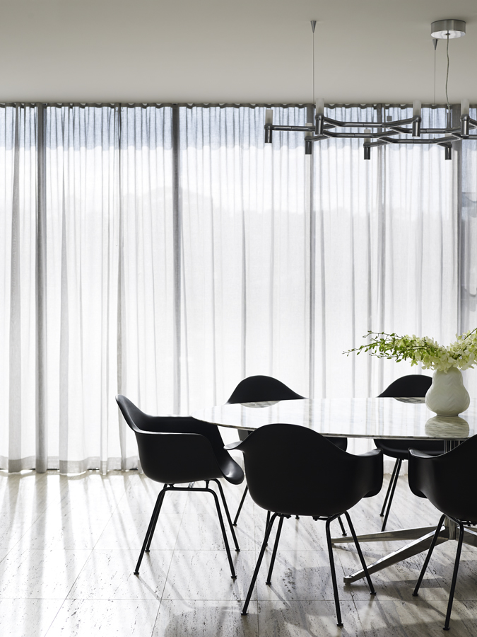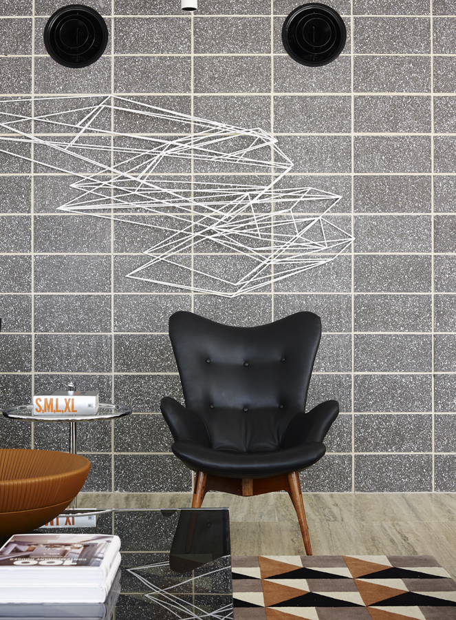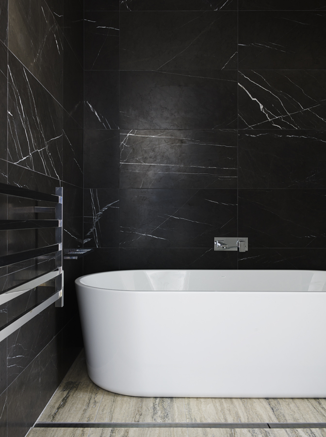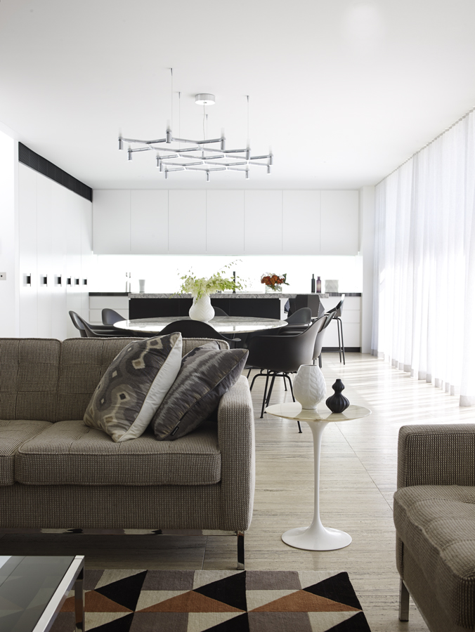 Upstairs, a charcoal and white carpet by Greg Natale for Designer Rugs echoes the house’s monochrome palette at a softer level, tonally and texturally, while the layering of pieces and tones such as tan and smoked glass add warmth.